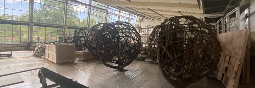 The complex and small-scale elements demanded a precise interplay between the interdependent artistic and technical trades. The skilfully woven sculptures dominated the stage. Based on steel scaffolding, the tree bark was skilfully sculpted and then painted. Some of the elements, such as the oversized tree balls, were then illuminated. Cakes for Orfeo and Euridice's wedding table were created in two versions in the sculpture and upholstery departments: one decorated with flowers and appetisingly colourful, the other mouldy and musty black.